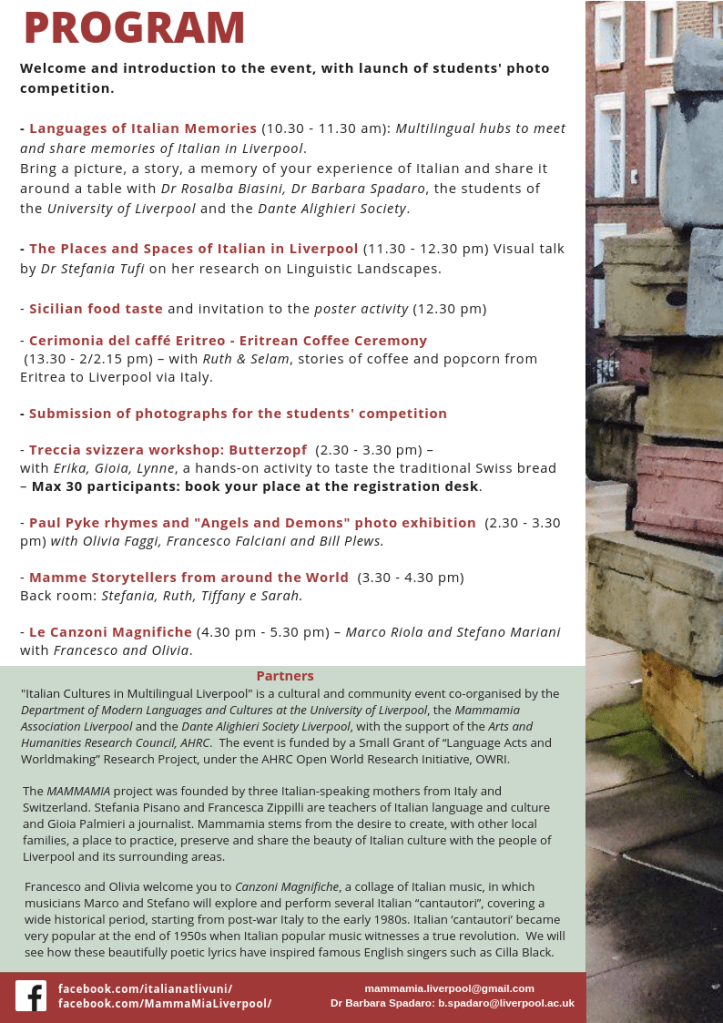 What is Italian culture in Liverpool today, and who are the people that share Italian food, language, music, stories? In November 2018 the University of Liverpool’s Department of Modern Languages and Cultures, the Mammamia Association Liverpool and the Dante Alighieri Society Liverpool organised a day of storytelling, creative activities, food tasters and music to explore the diversity of Italian culture in the city of Liverpool.