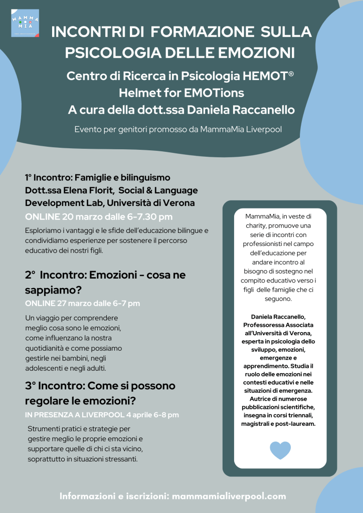 MammaMia Liverpool è lieta di presentare una serie di tre incontri dedicati ai genitori per approfondire la psicologia delle emozioni e il loro ruolo nell’educazione dei figli. Due incontri si terranno online e uno in presenza a Liverpool.