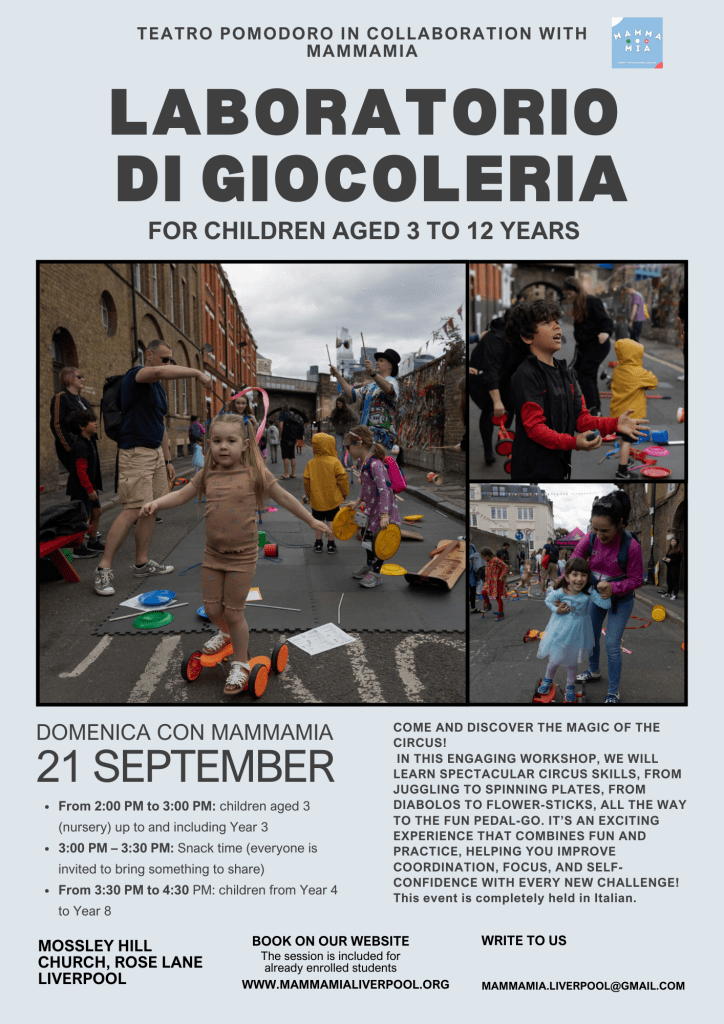 Are your children ready for an unforgettable adventure? Join us for a spectacular circus workshop hosted by Teatro Pomodoro in collaboration with MammaMia, where fun, creativity, and learning come together!