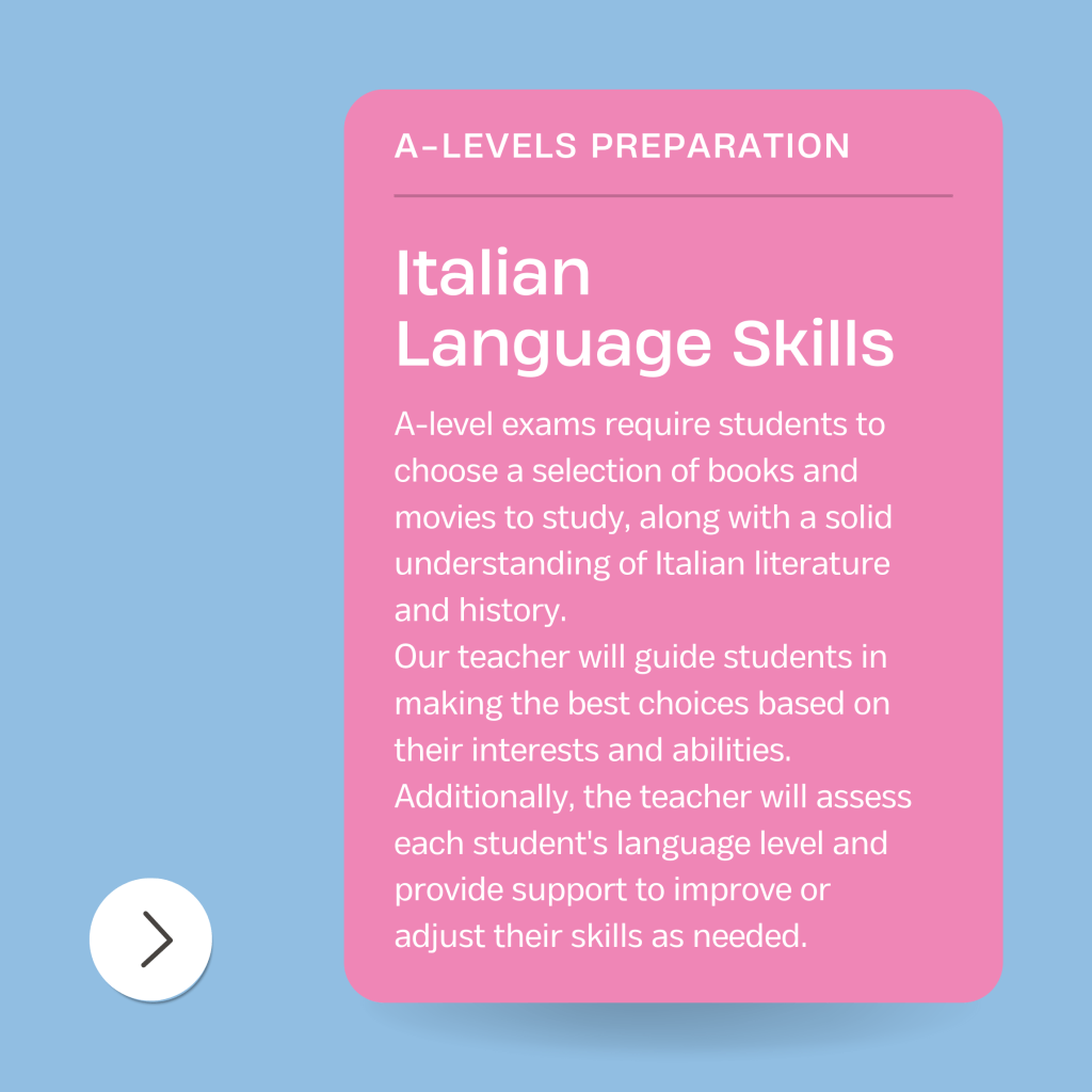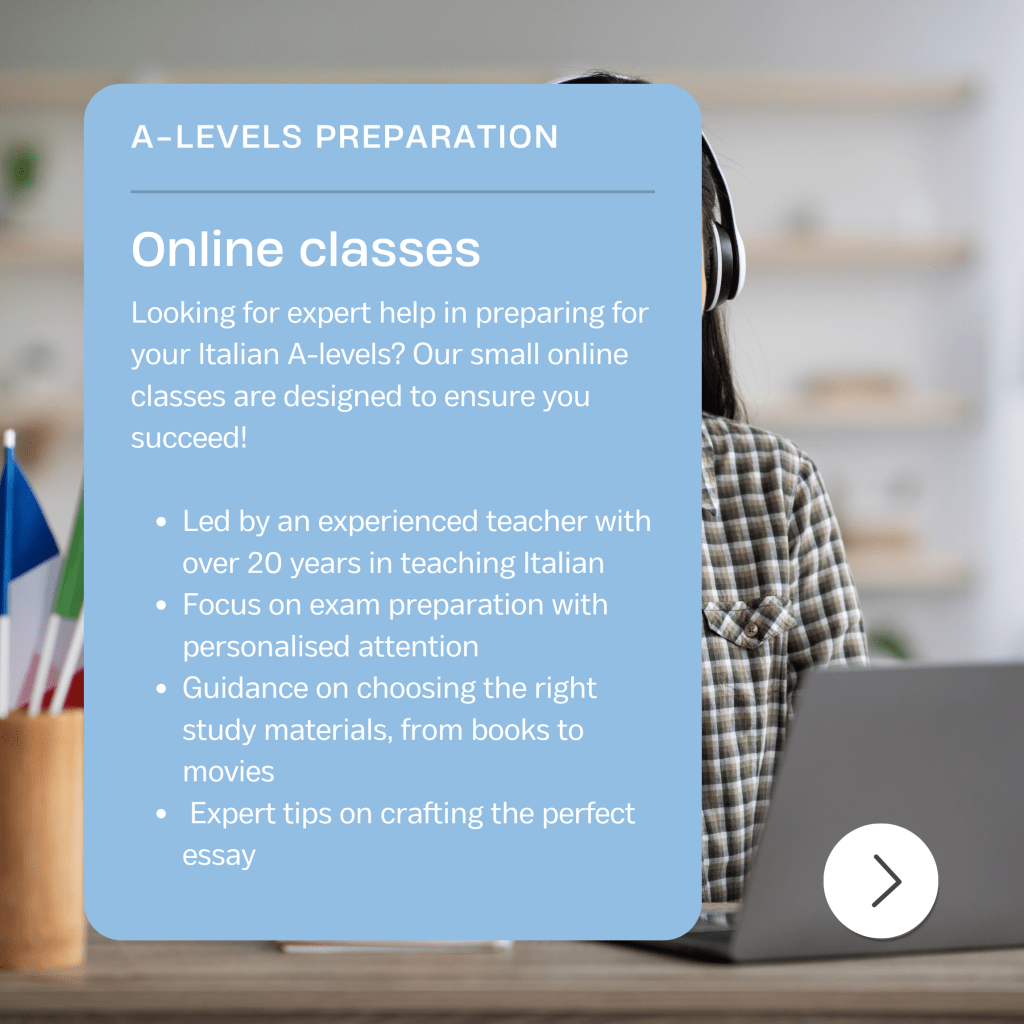 This online course is designed to prepare you for the Italian A-Level exam. It will help you further develop all four language skills, equipping you to use Italian for practical communication at an advanced level. With live, interactive classes, you’ll receive expert guidance to ensure your success.